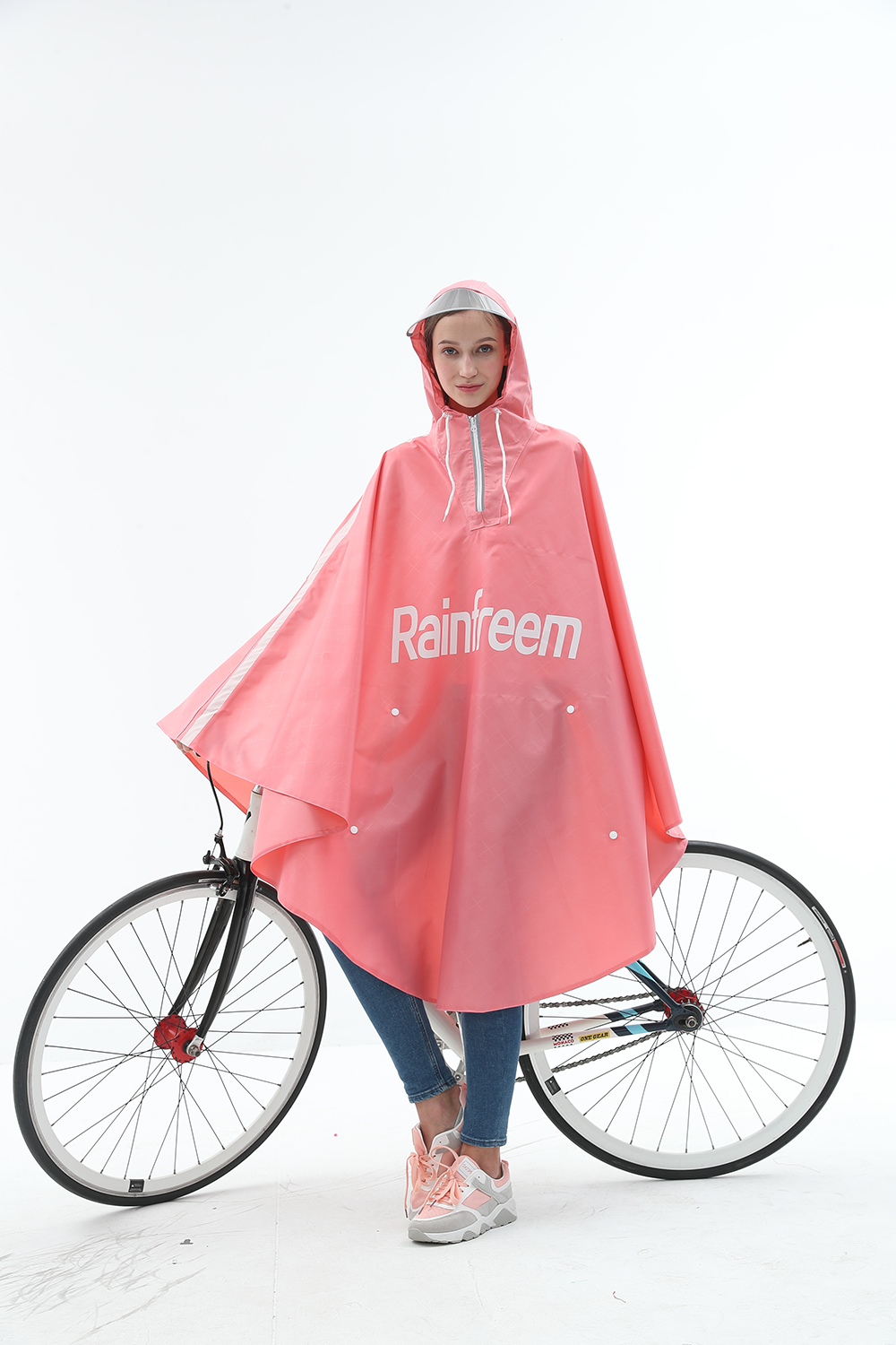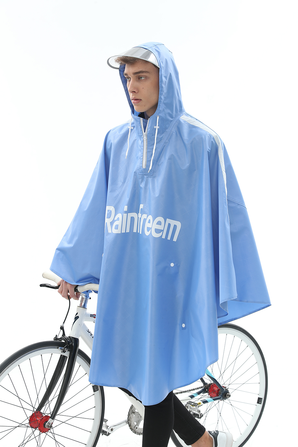 时尚版型,自行车骑行雨披。连帽设计,牛津面料,高温压胶工艺,内有防飘松紧带、外有高亮反光印花确保骑行安全。