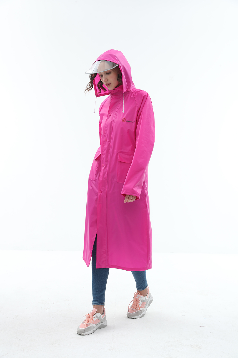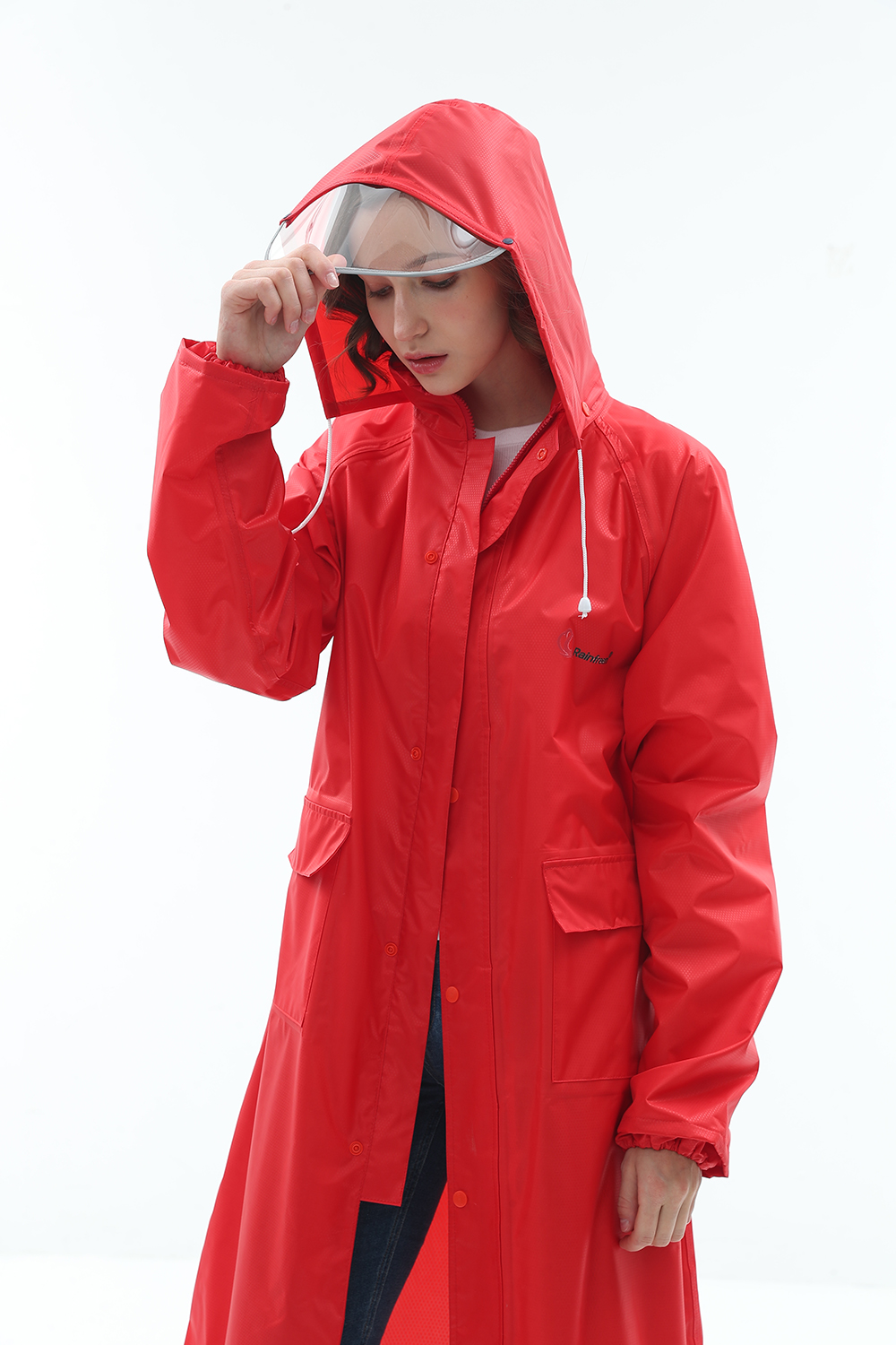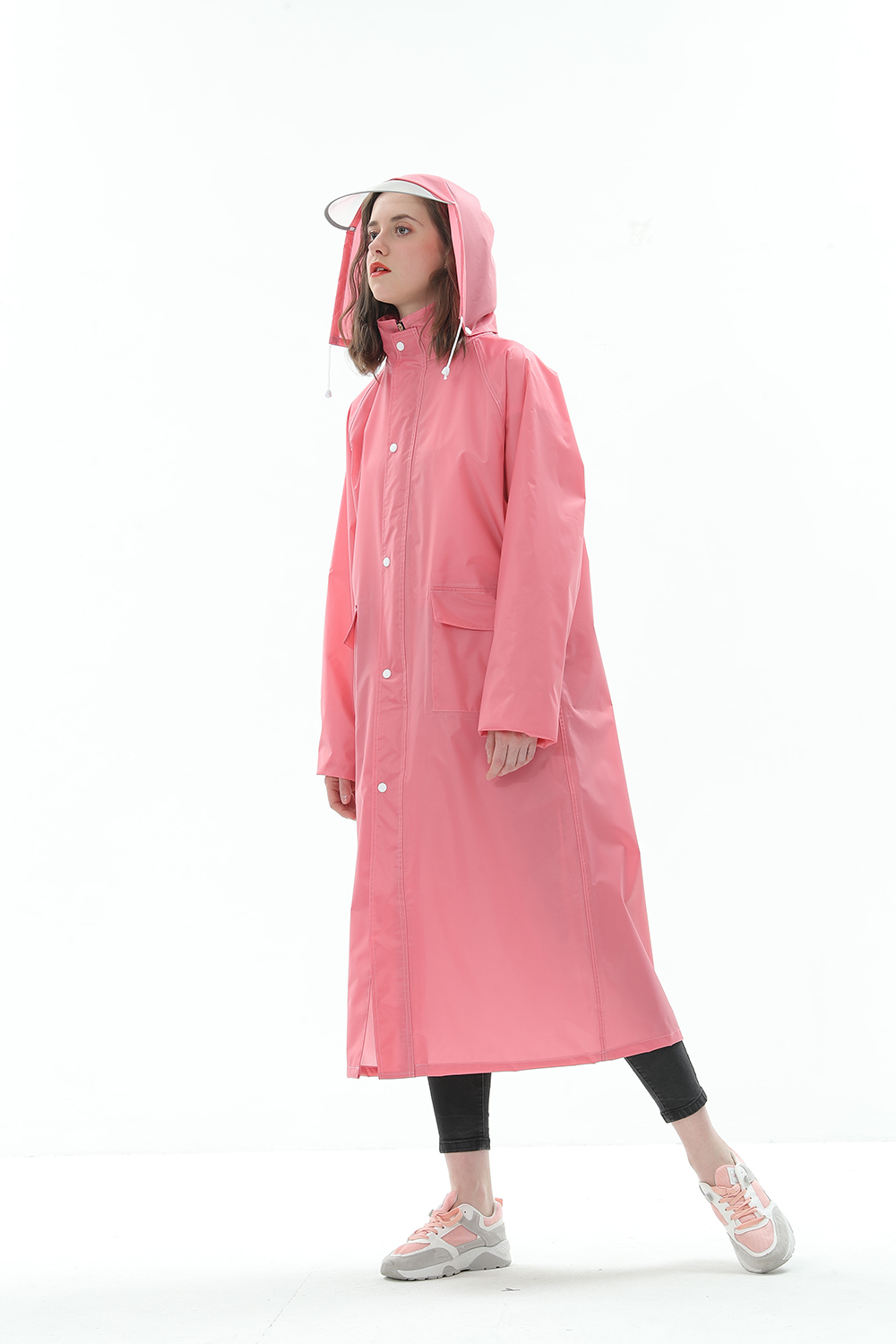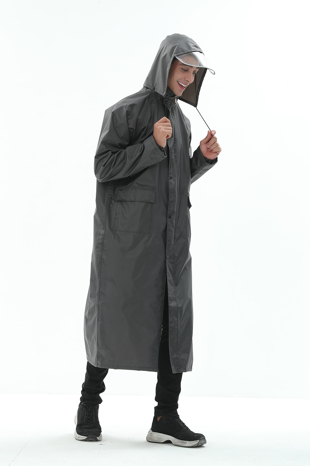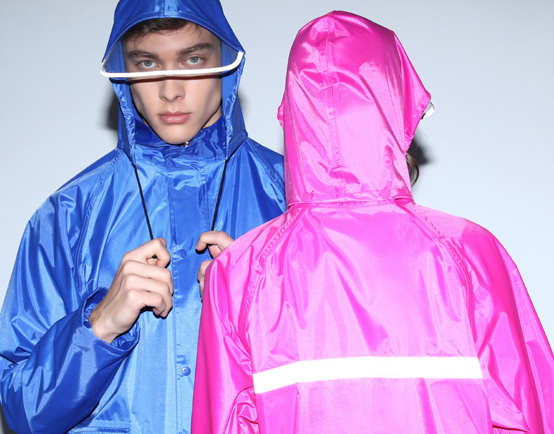 风衣式雨衣,修身美观,大气时尚,双层呵护,透明帽檐。