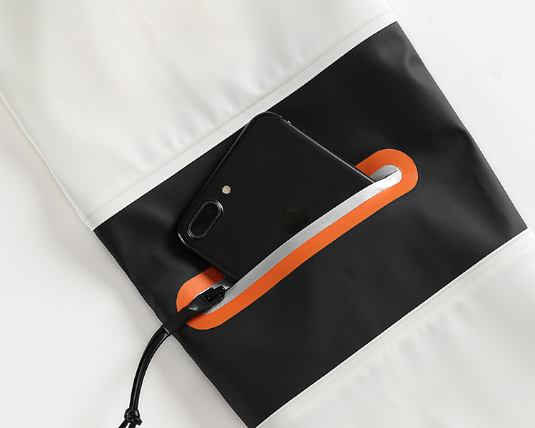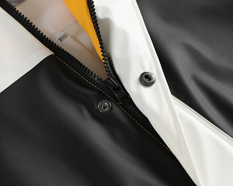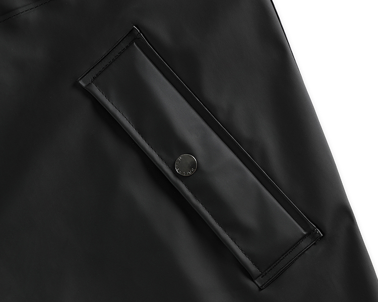 激光口袋,双重门襟,双重防水。PU面料强力防水,面料质感鲜明,冬天不发硬,质感舒畅,高频压胶工艺。
