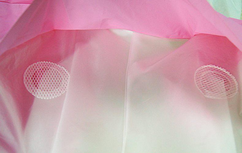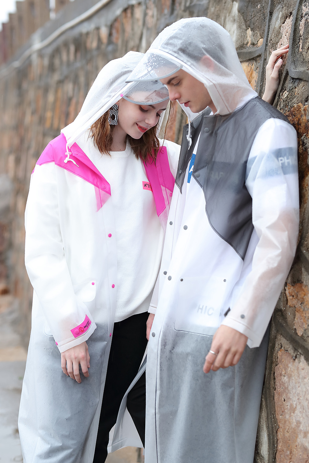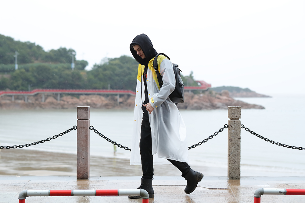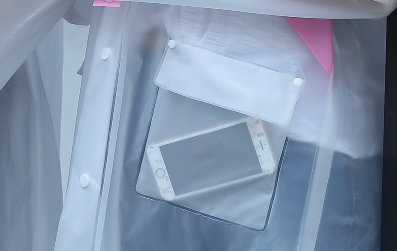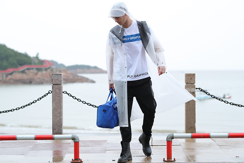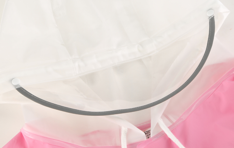 风衣式版型,拼色。连帽设计,脱戴方便。采用EVA环保面料,整件衣服不超过450克。
