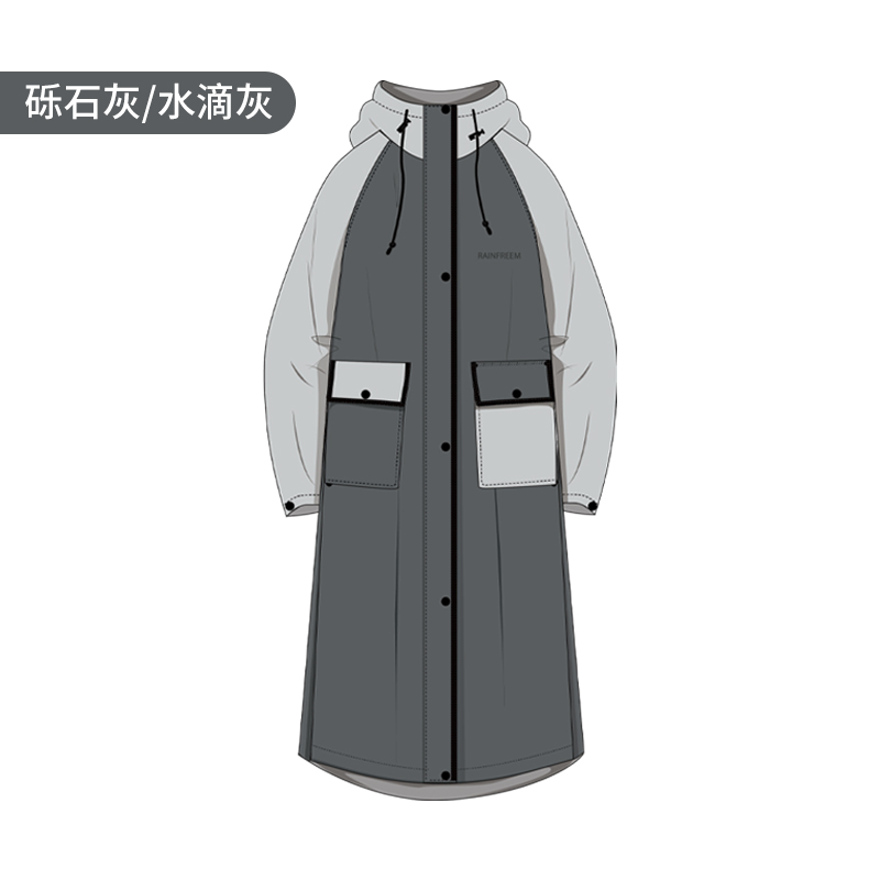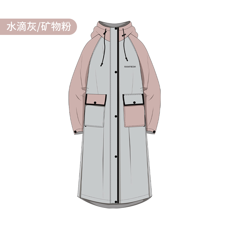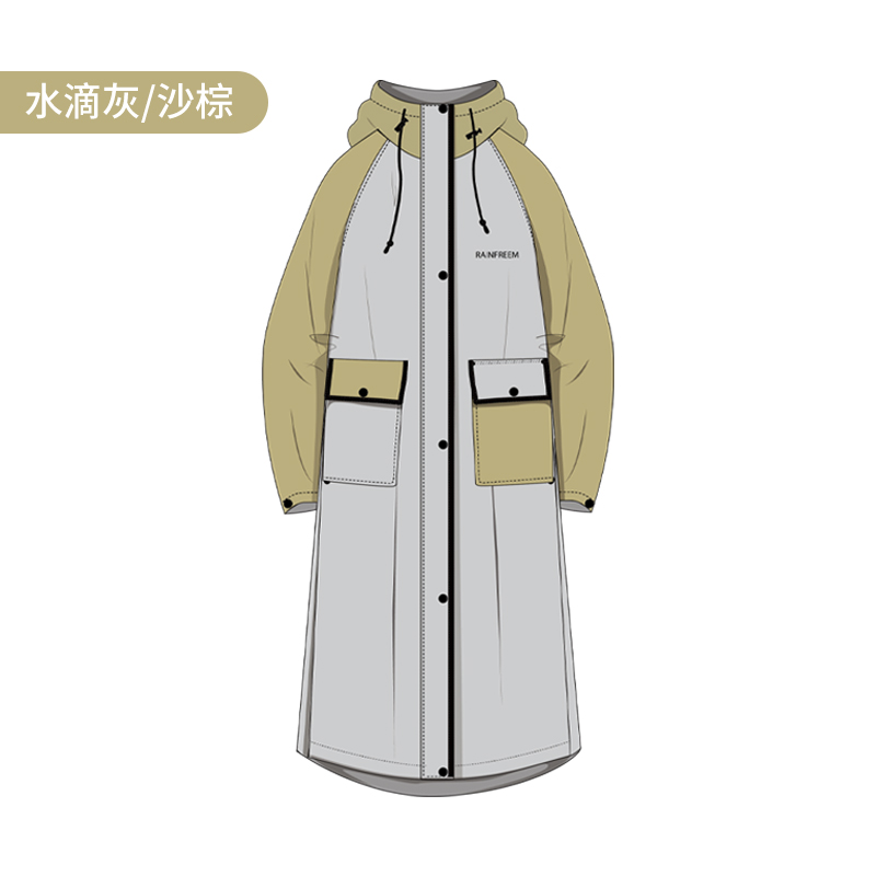 图3:琴飞曼拼色风衣式雨衣,细节展示连帽设计、拼色口袋等