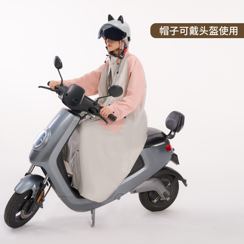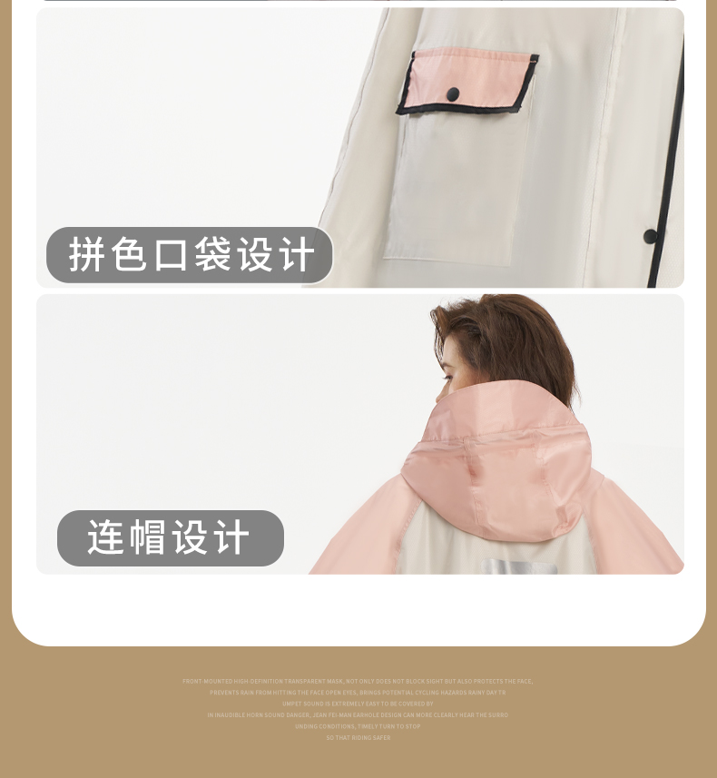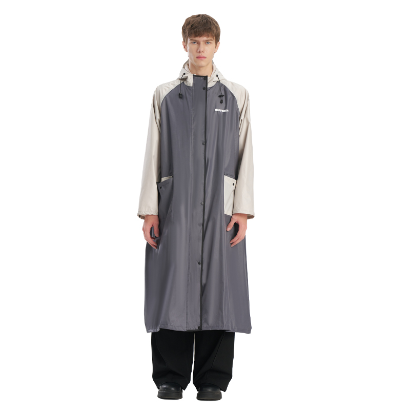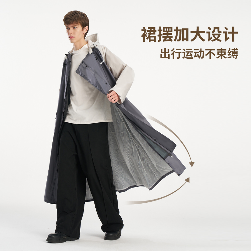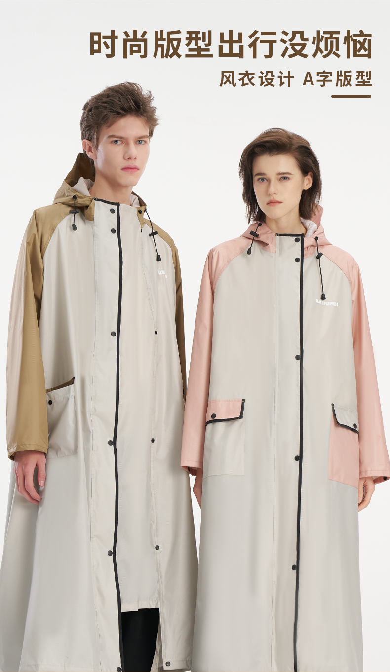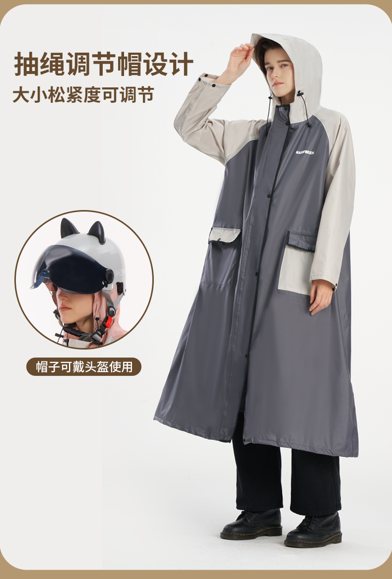 图2:琴飞曼拼色风衣式雨衣,帽子可戴头盔、可调节大小松紧度
