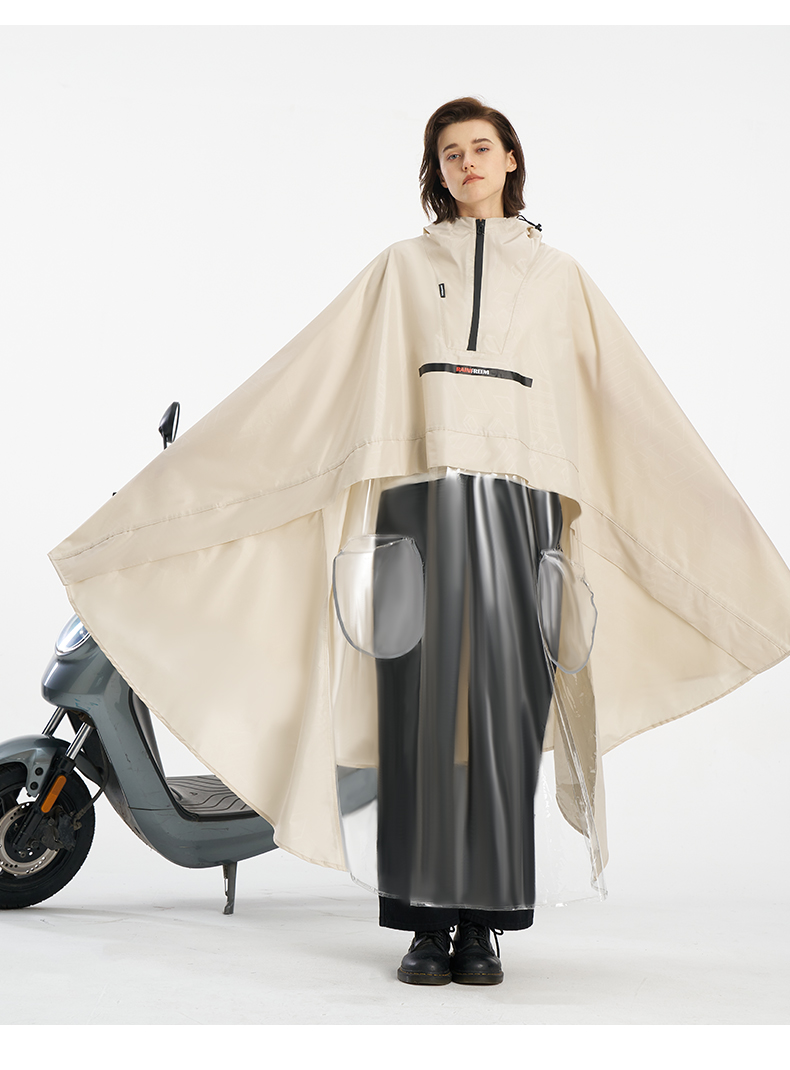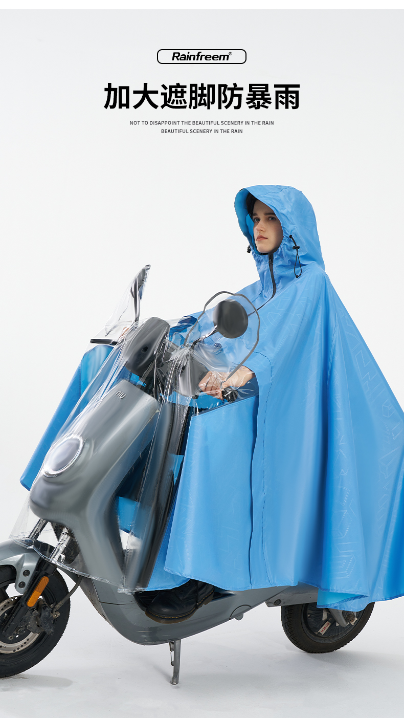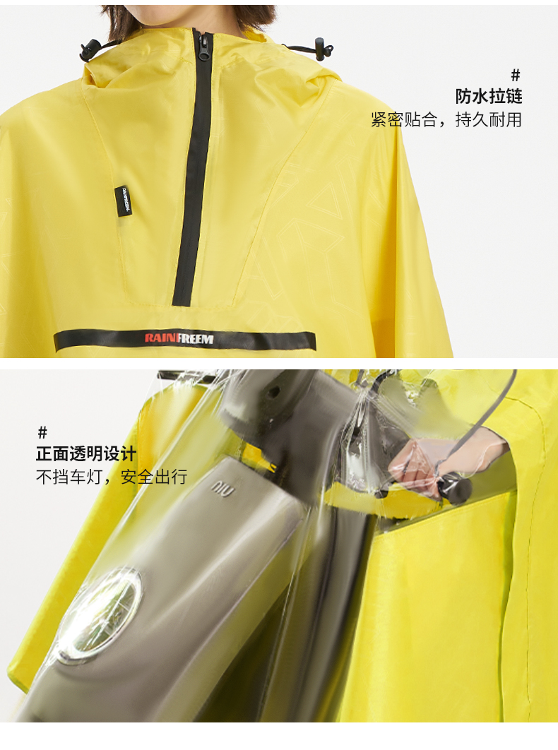 图4:琴飞曼全身防暴雨骑行雨披,可收紧帽绳、防水拉链、正面透明设计