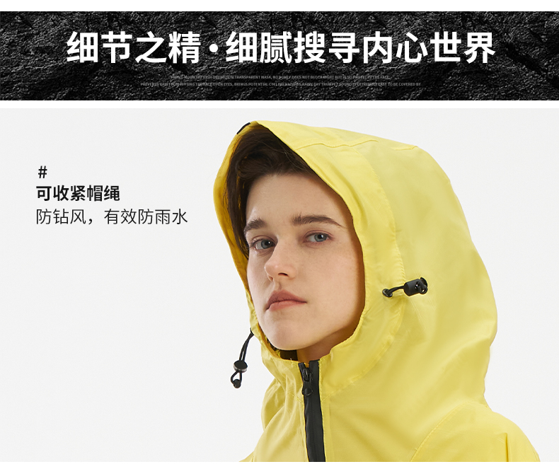 2. 防水防风:可调节帽子、防钻风,加宽下摆设计、雨天遮脚不湿鞋。