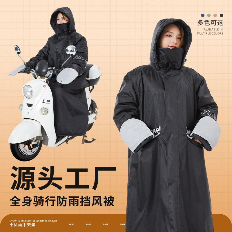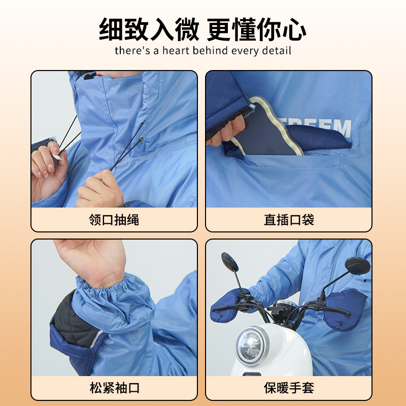 外层采用压胶工艺牛津布,结合内层加厚绗棉锁温层,防风防水性能较普通挡风被提升60%;手套与衣身一体式设计避免丢失,加长下摆覆盖至脚踝,彻底解决传统产品“漏风”痛点。后背及侧缝嵌入高亮反光条,提升夜间骑行安全。