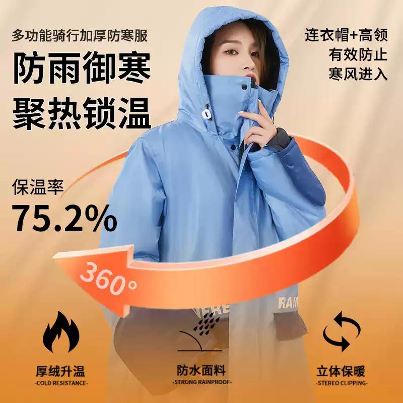 A字加长版型+后背开叉:优化骑行姿态灵活性;模块化多功能结构:整合连衣帽、高领、保暖手套、直插口袋等细节,实现“一衣多穿”,适配骑行、散步、垂钓等多场景需求;3D立体剪裁:通过加宽下摆和肩部空间设计,提升保暖性同时避免行动束缚。